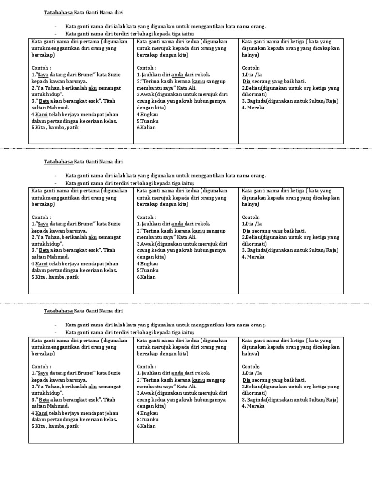Beliau digunakan untuk orang yang dihormati seperti ibu bapa, guru dan menteri. (a)kata ganti diri (pertama, kedua, dan ketiga) Live worksheets > malay > bahasa melayu (bm) > tatabahasa > kata ganti nama diri. Kata ganti nama diri ketiga (pihak / orang yang diceritakan halnya). Ayat pasif diri pertama dan kedua (saya, kami, kita, kamu, engkau, awak).