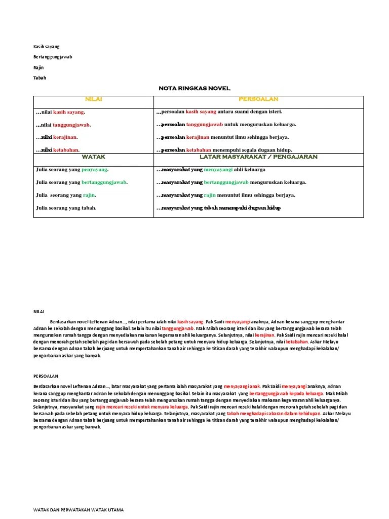 ← tema dan persoalan (novel tingkatan 3). Perwatakan beliau yang disukai oleh pembaca ialah beliau merupakan seorang yang rajin. Watak dan perwatakan (novel tingkatn 5). anak sulung daripada tiga orang adik beradik. Start studying novel (leftenan adnan). (b) mempunyai abang yang bernama mail dan adik yang bernama jariah. Leftenan adnan rajin membantu ayahnya bekerja di sawah dan menoreh getah pada setiap pagi walaupun baru berusia 10 tahun. Doc komsas fxdilz smkst academia edu. Bm tingkatan 4 10 peristiwa penting dalam novel leftenan adnan必学的十个重要的故事情节. Buktinya, adnan rajin membantu ayahnya menoreh getah, bersawah padi dan. Novel otros contenidos más fichas interactivas de novel. Tidak gembira pulang ke kampung datuk dan neneknya. Novel leftenan adnan wira bangsa, karya penulis novel sejarah prolifik abdul latip talib, memaparkan kisah serangan terakhir askar jepun di singapura serta keberanian dan keperwiraan askar melayu yang sanggup berjuang sehingga ke hujung nyawa.