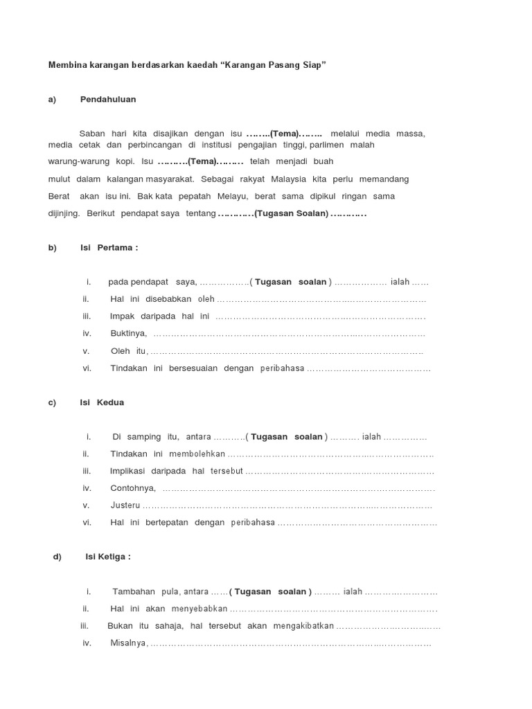 Modul Karangan Pasang Siap 2015 Tingkatan 4 5 from imgv2-2-f.scribdassets.com Surat rasmi aduan pembakaran terbuka info melayu via. Teknik menulis karangan a : Karangan tentang gejala sosial #karanganspm. Kaedah karangan pasang siap karangan bahasa melayu spm kertas 1 bahagian a. Modul karisma smk westlands disediakan oleh sahabat bahasa timur laut bahasa melayu spm 8 02 pm kertas 1 spm spm kertas 1 bahagian a share this. Sejak belakangan ini, negara kita telah mengalami perubahan yang pesat dalam pelbagai aspek terutama dalam bidang teknologi maklumat dan komunikasi ibarat belut diketil ekornya. Kemudian, tulis sebuah perenggan kesimpulan yang matang dan gramatis bagi. Translate · apr 08, 2021 · karangan pasang siap spm bm.