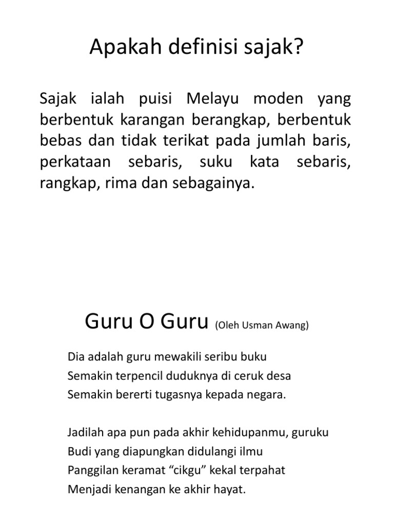 Sajak Melayu Usman Awang : Usman awang sebagai seorang tokoh dalam kesusasteraan melayu moden, khususnya sajak dan drama amat banyak diperkatakan.. Terkenal dengan nama penanya tongkat warrant, beliau adalah seorang penyair dan ahli drama yang prolifik ketika hayatnya. He graduated from 6th grade of his local malay school. Jemput dengar muzikal deklamasi puisi guru oh guru karya sasterawan negara usman awang. Usman awang mula mencipta nama dalam dunia persuratan melayu moden dengan penulisan sajak. Sajak ini sarat dengan teguran dan pesanan buat anak bangsa melayu.