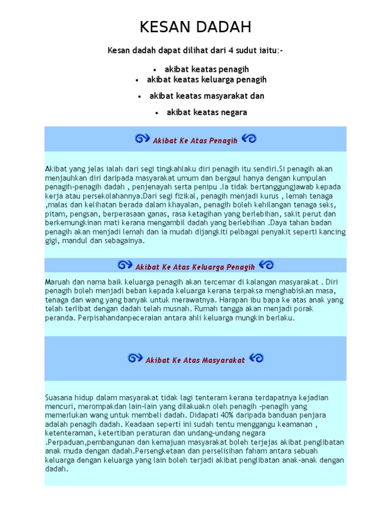 Penyalahgunaan dadah banyak memberikan kesan atau akibat yang negatif kepada si penagih dadah. (ini adalah contoh gambar yang di ambil dari laman google). Jumlah ini meningkat kepada 803 jenis nps pada 2017 iaitu peningkatan sebanyak 136 peratus, katanya. Penyalahgunaan dadah berlaku apabila anda menggunakan bahan terlarang atau tidak dengan cara yang tidak sepatutnya. Dadah sememangnya mendatangkan pelbagai kesan buruk, bukan sahaja terhadap individu itu sendiri, bahkan terhadap keluarga, masyarakat dan negara juga. Dadah adalah bahan kimia yang mempengaruhi penyalahgunaan dadah juga memberi kesan kepada produktiviti dan kejayaan anda di tempat kerja. Mari saksikan video ini bagaimana kesan dadah kepada diri kita, keluarga dan kerjaya. Penagihan akan menjauhkan diri daripada masyarakat umum dan bergaul hanya dengan kumpulan penagih. Berdasarkan life skills training programs (lst). Penyalahgunaan dadah bukan sahaja menyebabkan kerosakan terhadap diri tetapi turut memberi kesan terhadap keluarga, masyarakat dan negara. Harapan ibu bapa ke atas anak menjadi musnah. Daripada lima yang bergantung kepada penggunaan bahan melalui rawatan pencegahan dadah. Meningkatkan pengetahuan, kefahaman dan kesedaran di keluarga dapat diberikan panduan bagi memastikan ahli keluarga bebas daripada dadah;